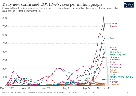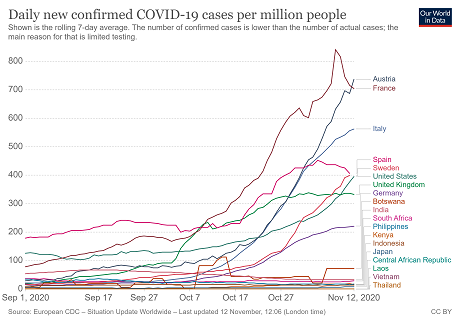 Auf der anderen Seite sehen wir Schweden, das bekannterweise einen anderen Weg gewählt hatte und auf Lockdown und strikte Durchsetzung von „AHA“-Regeln verzichtet hatte. Aber auch hier hat das Testen zugenommen, von 0,96 Ende Juli auf 2,73 Anfang November. Kein Wunder also, wenn auch hier „mehr Fälle“ kommuniziert werden können.