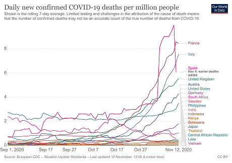 Und auch der andeutungsweise exponentielle Verlauf für Spanien (rote Kurve mit dem dramatischen Höchstwert) wendete sich blitzartig exponentiell in sein vollkommenes Gegenteil. Es gibt aber hier in der Kurve einen Hinweis, dass am 4. November, wo dieser dramatische Anstieg zu verzeichnen war, frühere Todesmeldungen eingefügt worden waren.