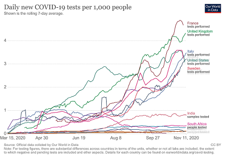 Ende März wurden in Deutschland ca. 0,6 Tests pro 1000 Einwohner durchgeführt. Anfang November waren es dann ca. 2,7 Tests.
