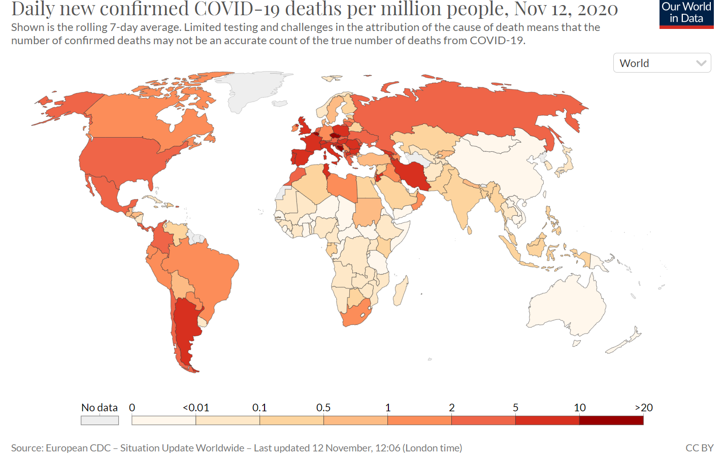 Interessant ist hier, dass ausgerechnet China einen Wert von 0 aufweist. Wenn man sich allerdings die Karte mit der Verteilung der Tests anschaut, dann ist der Wert für China am 12. November 2020 ebenfalls 0. Offensichtlich hat China aufgehört zu testen und lässt den Rest der Welt sich an den Rand des Abgrunds testen. Wenn man auf der Zeitschiene zurückfährt, dann sieht man, dass es für China bis zum Anfang des Jahres keine Daten gegeben hat, wie viel dort getestet wurde. Ist das nicht etwas merkwürdig?