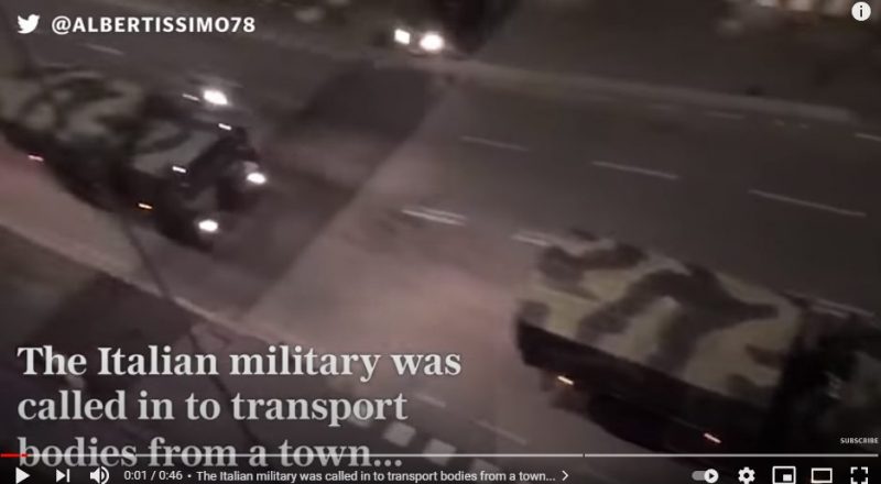 Der Konvoi war nicht endlos lang, sondern bestand nur aus 13 Fahrzeugen. Allem Anschein nach wurden in der Tat Verstorbene abtransportiert, die von den Massenmedien ohne Autopsie oder sonstige medizinische Abklärung als Covid-19-Opfer etikettiert wurden.