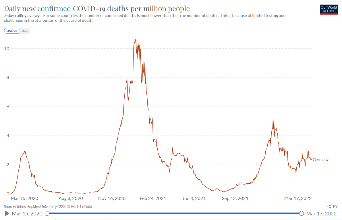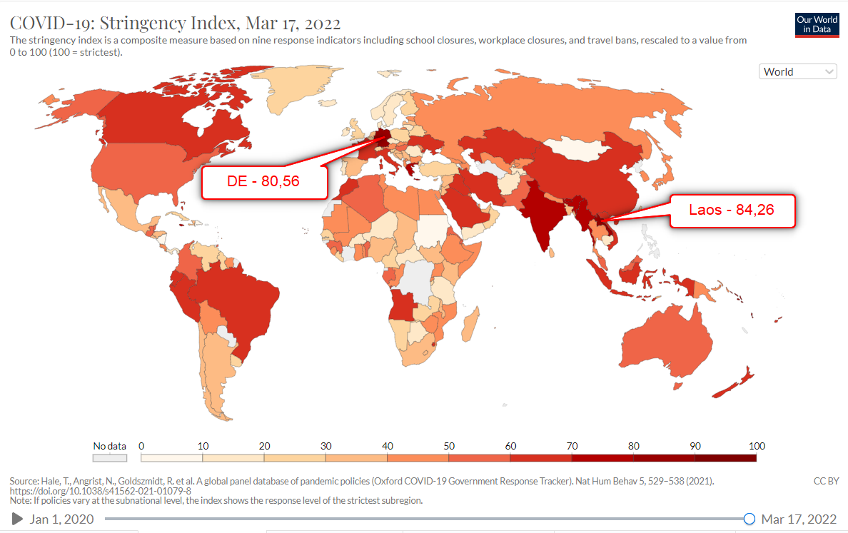 Vor der „Impfpflicht“ kamen die Maßnahmen, die Deutschland (fast) wieder einmal zu einem Weltmeister machten. Der bei „Our World in Data“ gelistete „Stringency Index“ (Strengeindex) vergleicht die Länder in der Härte ihrer Maßnahmen. Und da liegt Deutschland weit, weit vorne: