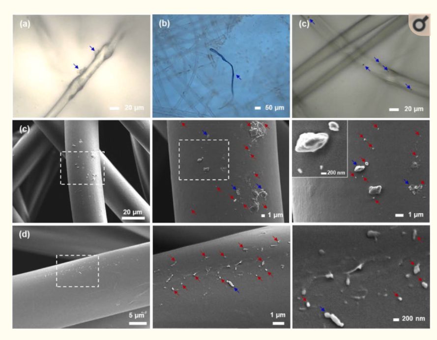 A), B), C) und D) sind elektronenmikroskopischen Aufnahmen von den meistverkauften medizinischen Masken in China. Die Aufnahmen wurden von den Innenseiten der Masken aufgenommen. Die Autoren beschreiben, dass die Fasern, Fragmente und Partikel im Mikro- Nanobereich zahlreich vertreten waren und zudem nur lose mit den strukturellen Fasern der Maske verbunden waren. Die blauen Pfeile zeigen Fasern, Fragmente und Partikel in Mikrometer-Größe. Die roten Pfeile zeigen Partikel und Fragmente in einem Größenbereich von unter 1,0 Mikrometer und im Nanobereich von unter 100 Nanometern.