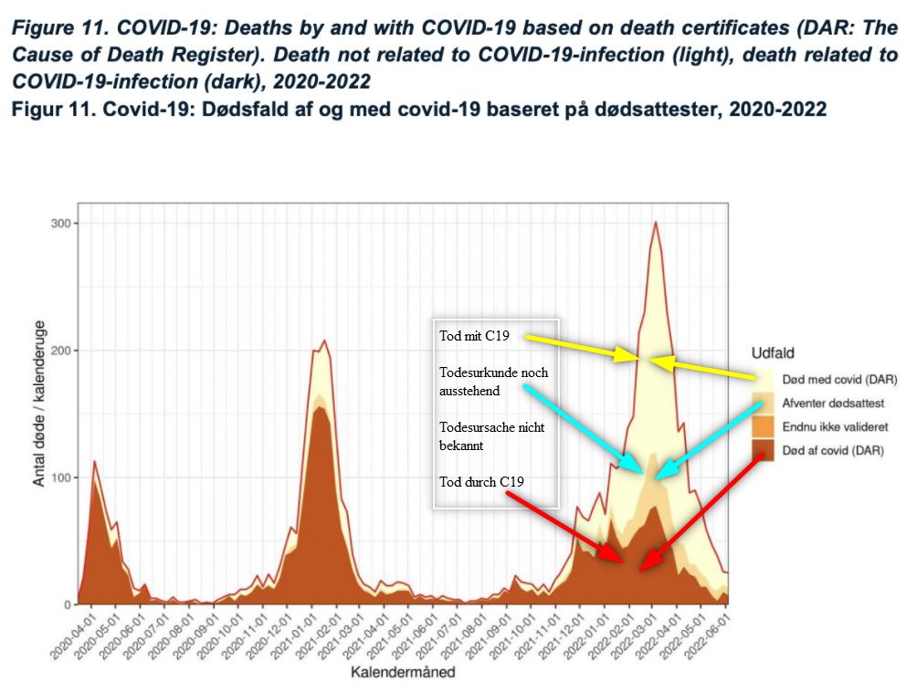 Unschwer lässt sich erkennen, dass die sogenannten „Corona-Todesfälle“ zum überwiegenden Teil Todesfälle waren, bei denen Covid-19 keine Rolle gespielt hatte. Die dänischen Behörden scheinen auch kein Problem zu haben, nach dieser Darstellung zu urteilen, diesen Sachverhalt so deutlich zu dokumentieren.