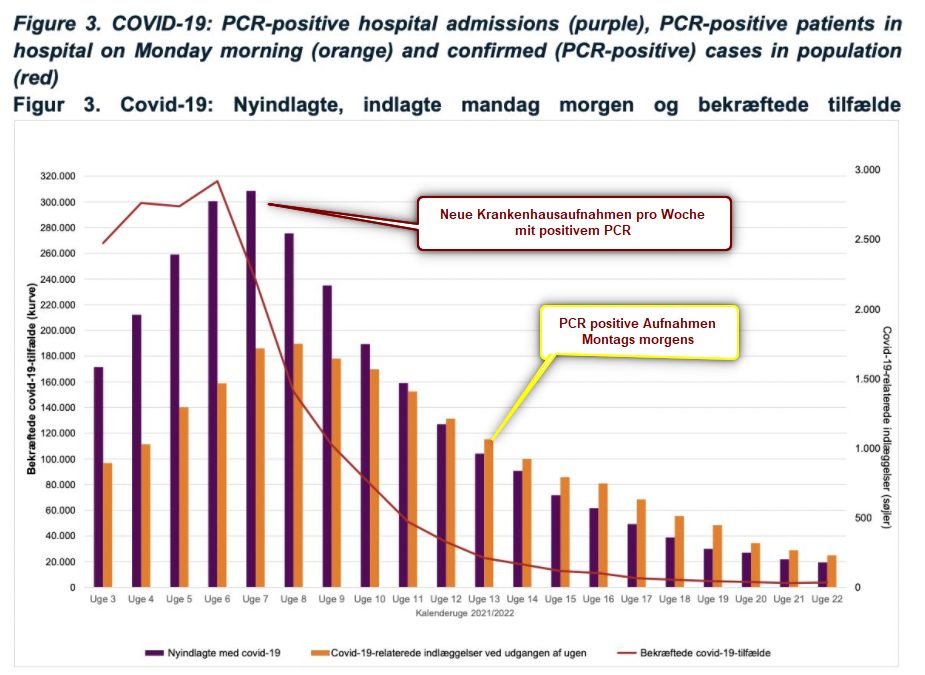 Was hier noch fehlt, das ist die Darstellung der bestätigten PCR-positiven Fälle, die als roter Balken dargestellt sein soll. Nur, nirgends sind rote Balken auf der Grafik zu finden. Dies dürfte ein Hinweis darauf sein, das wirklich bestätigte Fälle von Covid-19 in Dänemark inzwischen einen gewissen „Seltenheitswert“ haben könnten.