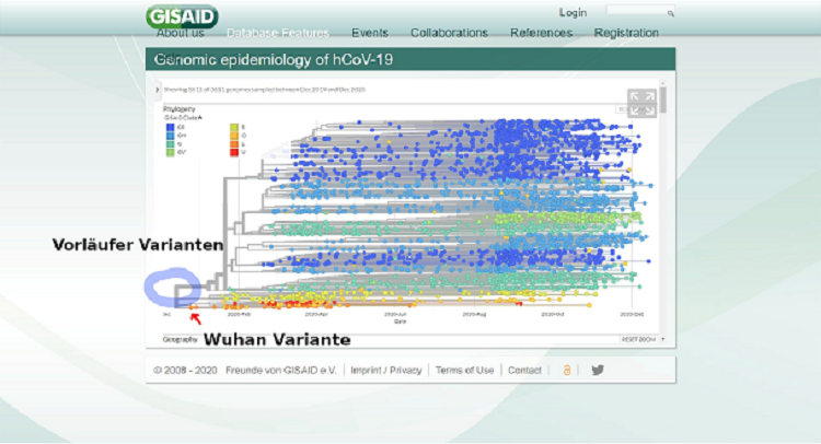 Wenn man die GISAID-Seite öffnet und kurz nach unten scrollt, dann erscheint unter dem Wort „Geography“ ein grüner Knopf, auf dem das Wort „play“ steht. Wenn dieser Knopf gedrückt wird, dann startet eine Animation, die die zeitliche Reihenfolge zeigt, in der neue Varianten durch Mutation entstehen und gleichzeitig alte Varianten untergehen.