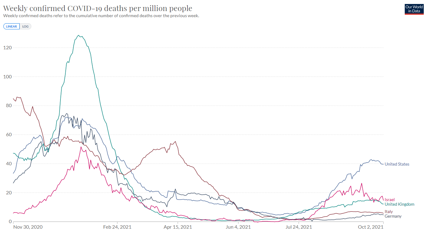 Dezember 2020 und Januar 2021 in Deutschland und jeweils über 100.000 Todesfälle. Wenn man sich die Daten von einigen Staaten (Deutschland, Israel, Italien, Großbritannien, USA „Covid-19-Todesfälle“) seit November 2020 anschaut, dann ergibt sich folgendes Bild: