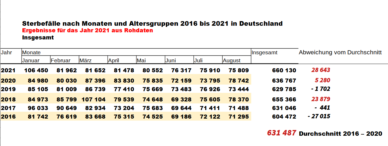 Auffällig ist die Summe von Januar bis August 2021, die über 660.000 beträgt. Mit einer Abweichung von über 28.000 Todesfällen vom Durchschnitt der vorausgegangenen 5 Jahre für diesen Zeitraum sieht es für 2021 bereits jetzt nach einer Übersterblichkeit aus. Der Januar 2021 alleine weicht vom 5 Jahresdurchschnitt, der bei ca. 86.500 liegt, um knapp 20.000 ab. Bleibt noch zu klären, welche Ursachen es für die restlichen 8000 geben könnte.