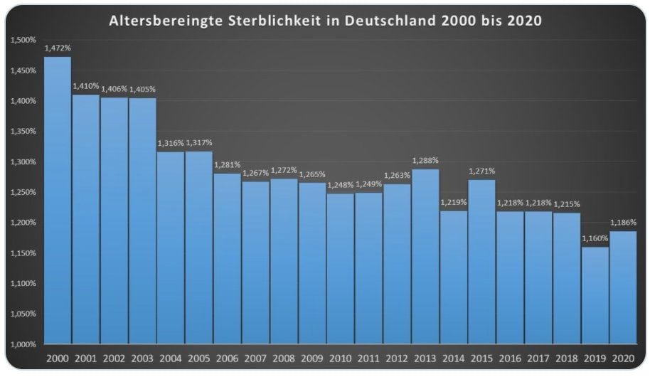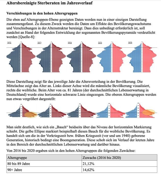 Wie bereits in den weiter oben zitierten Beiträgen erläutert, lässt sich eine Übersterblichkeit aus absoluten Zahlen kaum ableiten. Warum? Weil die Alterspyramide sich zu Gunsten der älteren Jahrgänge verschoben hat. Und weil es mehr Alte gibt, ist es nur logisch, dass auch mehr Todesfälle auftreten. Denn niemand lebt ewig.