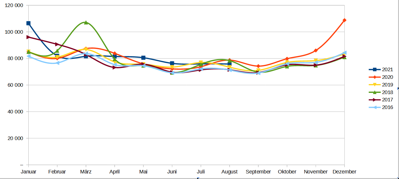 Februar, März und April 2021 verhalten sich im Vergleich zu den Vorjahren weitestgehend unauffällig. Erst der Mai zeigt eine etwas erhöhte Mortalität im Vergleich zu den Vorjahren, obwohl die Mortalität im Mai geringer ist als in den 3 vorangegangenen Monaten. Die Zahl für Juni fällt deutlich ab, ist aber im Vergleich zu den Vorjahren leicht erhöht. Juli und August dagegen sind im Vergleich zu den Vorjahren relativ unauffällig.