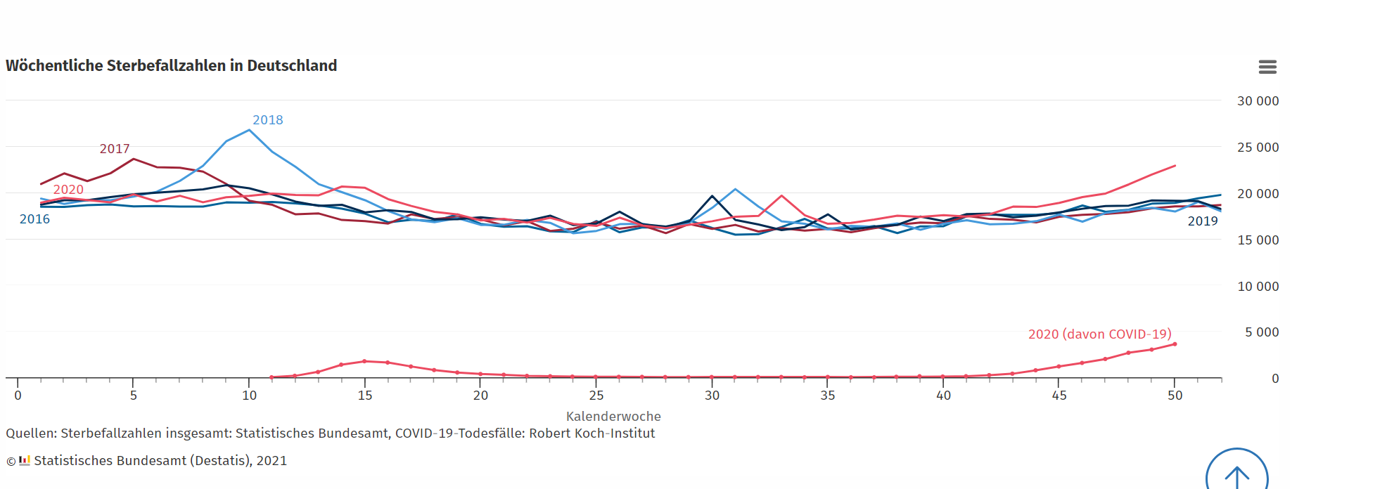 Das Statistische Bundesamt veröffentlicht auf seiner Webseite „Wöchentliche Sterbefallzahlen in Deutschland“ und vergleicht hier die Jahre 2016 bis 2020. Eine zusätzliche Kurve für „Covid-19“ zeigt in dramatischer Weise, wie augenscheinlich die Kurve für 2020 durch diese Covid-19-Kurve angehoben wird und damit zu einer Übersterblichkeit zu führen scheint.