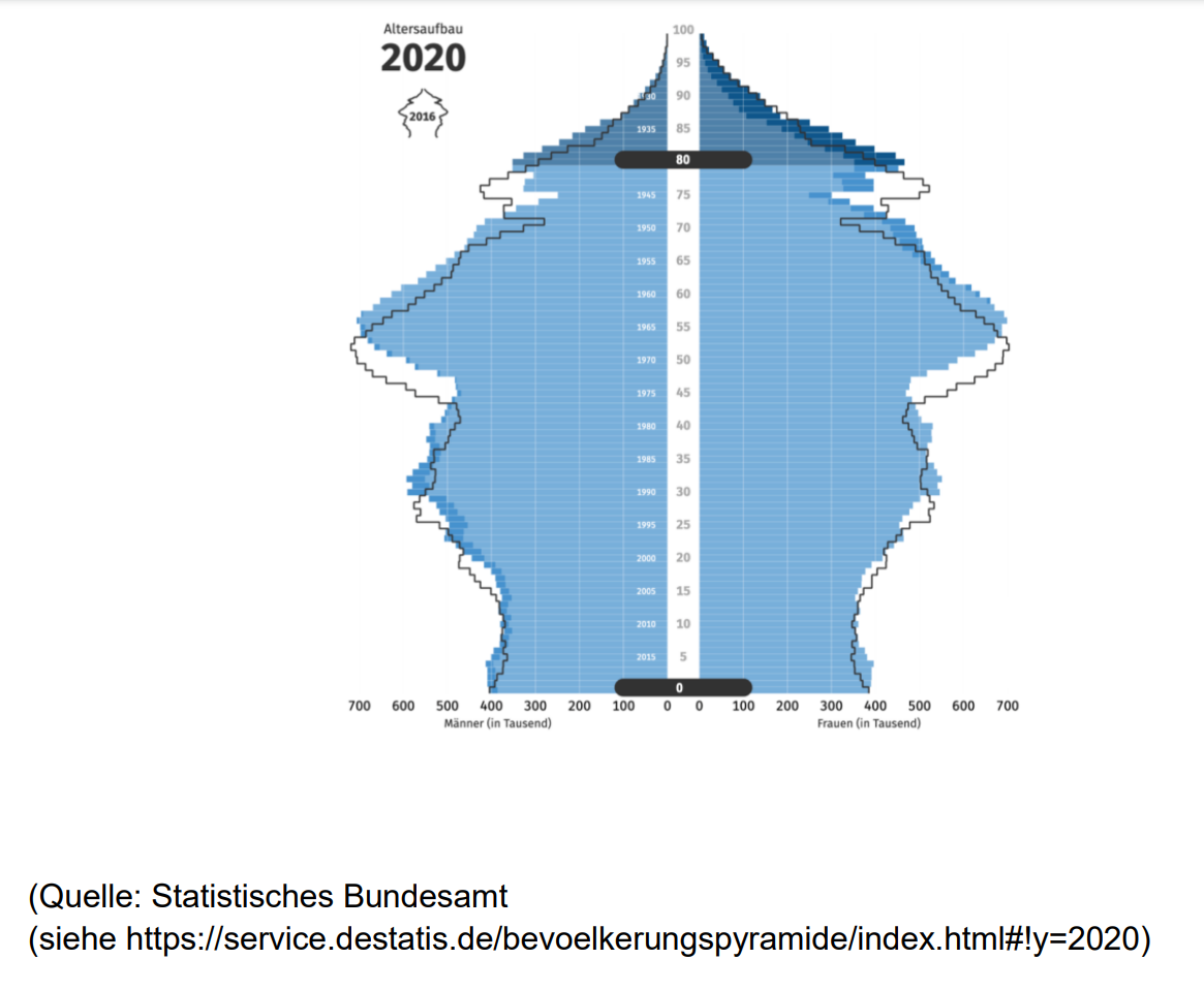 Diese Abbildung zeigt einen Vergleich der Altersstruktur von 2020 zu 2016. Man sieht deutlich, dass in den vier Jahren die Zahl der über 80-Jährigen (Männer und Frauen) deutlich zugenommen hat. Laut Angaben des Statistischen Bundesamts ist der Anteil der über 80-Jährigen an der Gesamtbevölkerung in den letzten zehn Jahren um 36 % gestiegen.