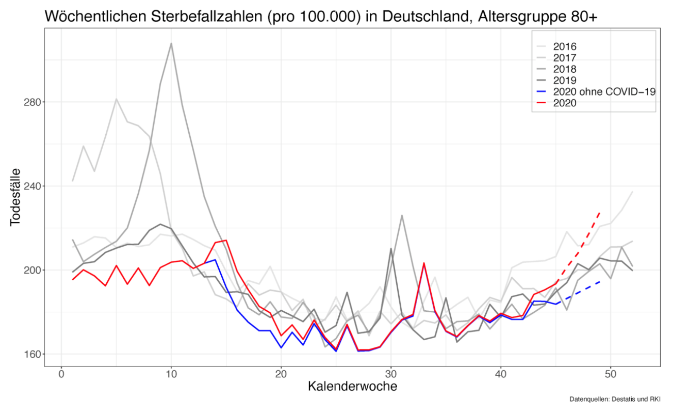 Außerdem stellt diese Kurve die Gesamtmortalität für alle Altersklassen dar. Hieraus wird nicht ersichtlich, welchen Anteil die Mortalität der über 80-Jährigen ausmacht. Der dürfte, wie bereits weiter oben gesehen, signifikant ausfallen.