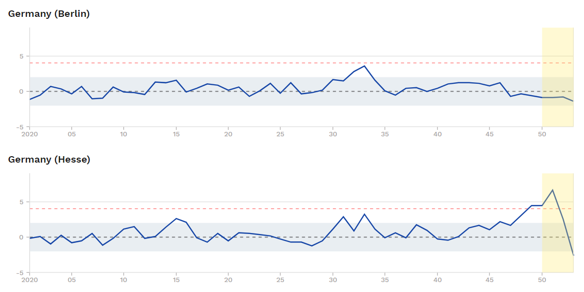 Während Berlin zum Jahresende einen sehr flachen, normalen Mortalitätsverlauf aufweist, mit Tendenz zu einer leichten Untersterblichkeit, gibt es in Hessen einen kurzen, mächtigen Peak, der sofort in eine relativ ausgeprägte Untersterblichkeit abtaucht.