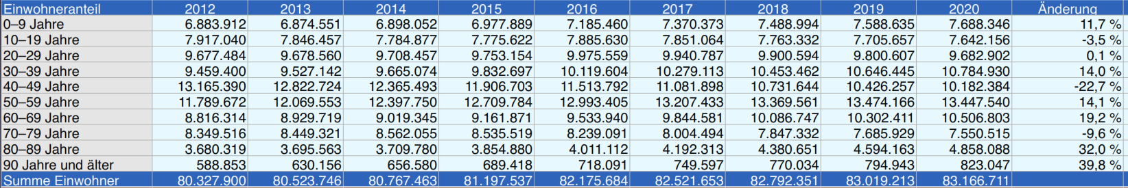 Und so sieht die Einwohnerzahl für Deutschland für die Jahre 2012-2020 aus. Die letzte Spalte zeigt die prozentuale Änderung für die jeweilige Altersgruppe (für eine größere Ansicht auf die Grafik klicken):