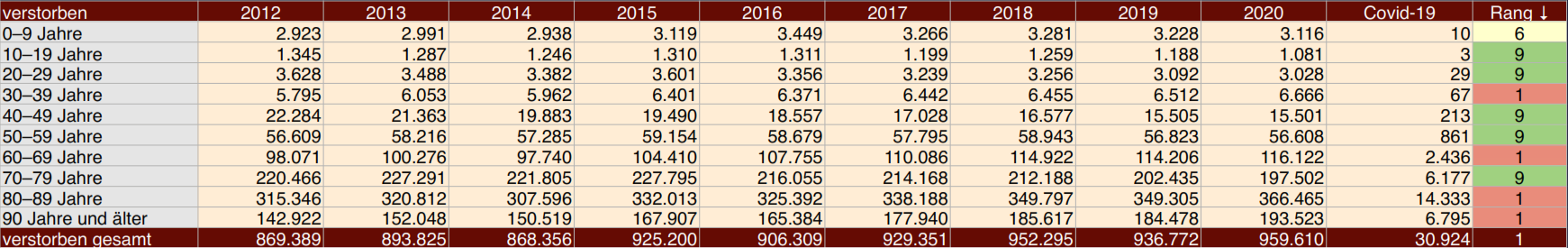 Am Ende dieser Tabelle gibt es eine „Rangliste“ von 1 bis 9 (die letzten neun Jahre betreffend). Diese Rangliste bezieht sich auf 2020 im Vergleich zu den Vorjahren. Bei den 80 bis 90-Jährigen und den 90-Jährigen und älter liegt 2020 auf Rang 1, weil in beiden Altersgruppen die höchsten absoluten Zahlen für die Mortalität vorliegen.