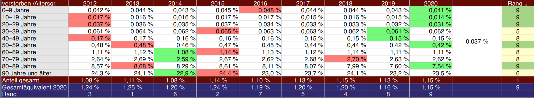 Das heißt an einem Beispiel erklärt, dass für den Jahrgang 80-89 Jahre im Jahr 2020 nur 7,54 % der über 4,8 Millionen 80-89-Jährigen verstorben ist. Und dieses Feld ist grün, weil in keinem anderen Jahr dieser Wert von 7,54 % unterschritten wurde. Deswegen zeigt die Rangliste hier die Nummer 9, also die geringste Mortalität seit 2012.