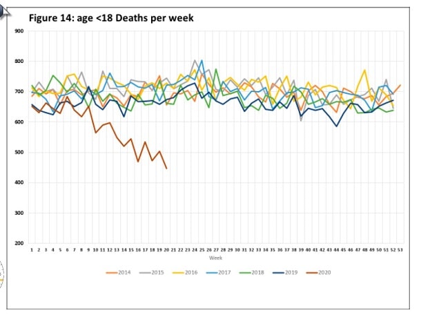 Es gibt kaum Berichte, die von diesem Phänomen sprechen. Am 12. Juli 2020 berichtet ein ehemaliger NASA-Wissenschaftler, ein Klimatologe, in seinem Blog[5] von einer sinkenden Mortalität von Kindern während/aufgrund des Lockdowns.