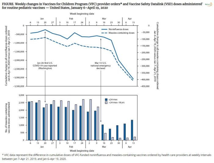 Was wir hier sehen, das ist ein dramatischer Rückgang der Masernimpfungen und der Impfungen, die nicht gegen Influenza gegeben werden. Und dieser Rückgang beginnt ausgerechnet zu einem Zeitpunkt, als in den USA der Lockdown verhängt wurde. Und zu diesen „Non-Influenza-Impfungen“ zählt unter anderem auch die Hepatitis-B-Impfung, die hier signifikant weniger zum Einsatz kam.