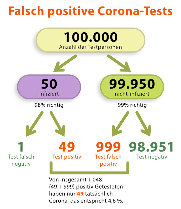 Der PCR-„Test“ als Instrument zur Legitimierung einer nicht vorhandenen Pandemie und zu deren fortlaufenden Verlängerung bedient sich nicht nur der falsch-positiven Testresultate, die bei ca. 1-2 % aller Tests liegen (von 100.000 Tests 1000-2000 falsch-positive Ergebnisse). Folgende Grafik zeigt dies viel besser, als ich das mit Worten beschreiben könnte:
