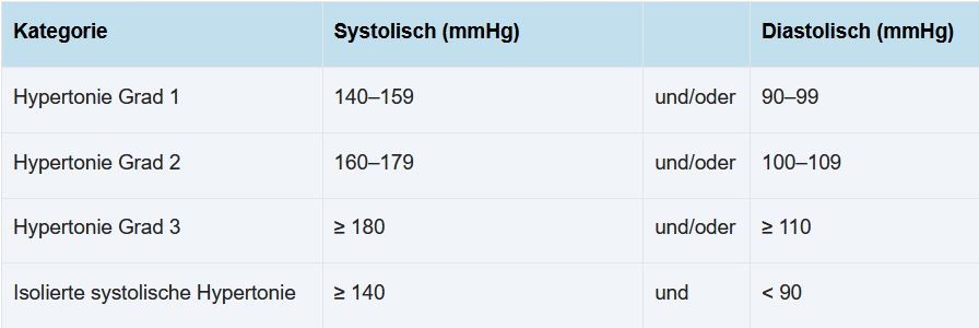 Der Bluthochdruck Grad I bis III und die Isolierte Systolische Hypertonie sind durch die NVL seit 2023 wie folgt festgelegt: