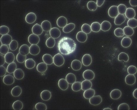 Abb.1: Hier sehen Sie eine Aufnahme eines Bluttropfens unter dem Dunkelfeldmikroskop. Die zahlreichen runden „Scheiben“ sind die roten Blutkörperchen die hier völlig „normal“ erscheinen. Das größere helle Gebilde in der Mitte ist ein eosinohile Granulozyt, der zu den weißen Blutkörperchen gehört. Rechts in der Mitte sehen Sie einige Thrombozyten (Blutplättchen). Diese sehen wie kleine „Spinnennetze“ aus.