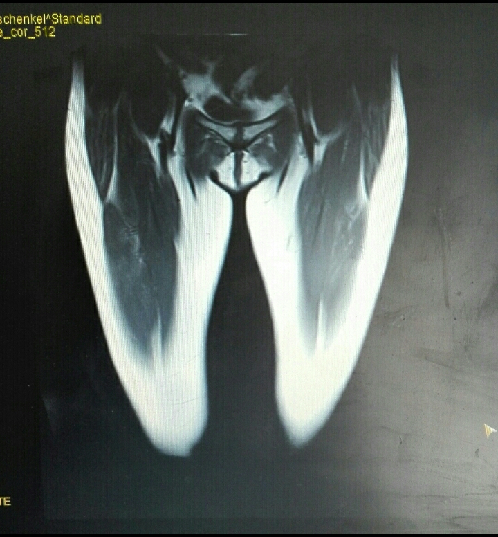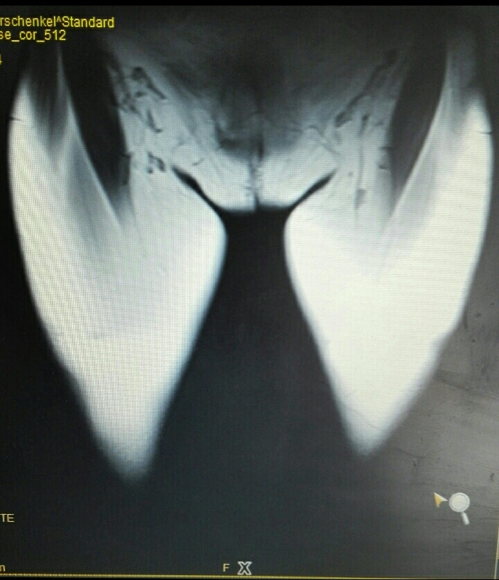 Mittlerweile habe ich eine neue Auswertung. Natürlich 200 km entfernt, die ebenfalls auf ein Knochenmarködem hinweist. Das rote Knochenmark verdrängt das gelbe.....