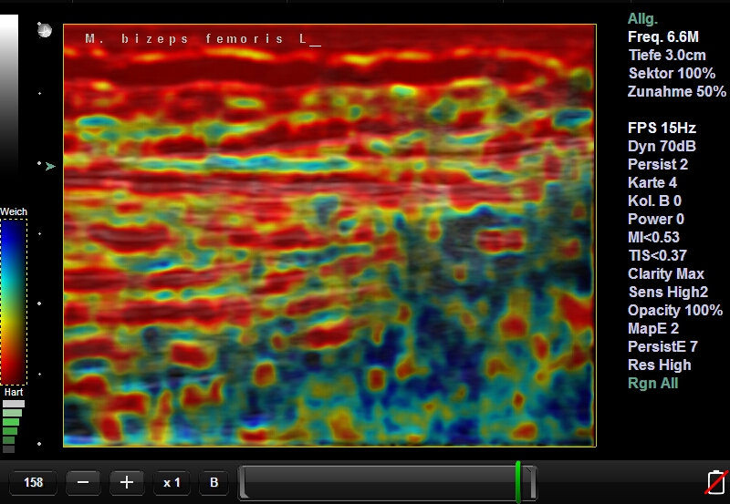 Folgendes Bild entstammt den Aufnahmen der Elastrographie der Muskeln. Rot ist verklebt/verhärtet teils mit Bindegewebe durchzogen.