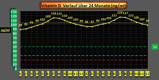 Zurzeit nehme ich auch noch ein mal die Woche eine Kapsel mit 50.000 IE, damit ich meinen Wert von 90 ng/ ml halte. Ob sich etwas nach oben verändert hat, werde ich bald erfahren, denn der nächste Test ist am Donnerstag