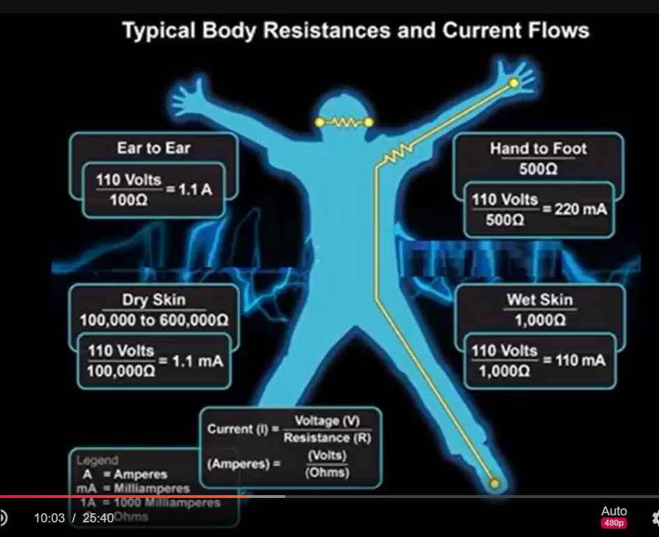 Typische Körperwiderstände und Stromflüsse des Menschen: