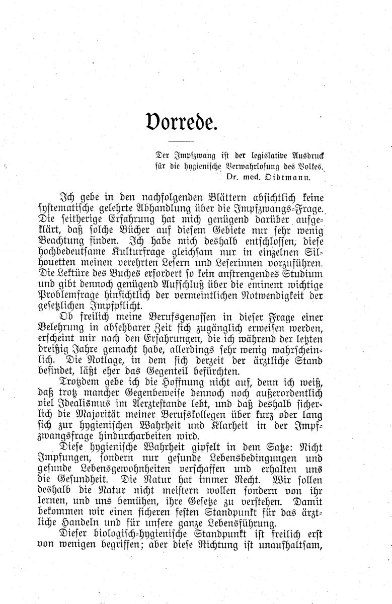 Möge das vorliegende Buch bei Ärzten und Nichtärzten zur Klärung der strittigen Impfzwangsfrage sein bescheiden Teil beitragen. Ich bin sicher, daß es niemand, der nur einigermaßen von den vorherrschenden Vorurteilen sich freigemacht hat, gereuen wird, das Buch zur Hand genommen zu haben.