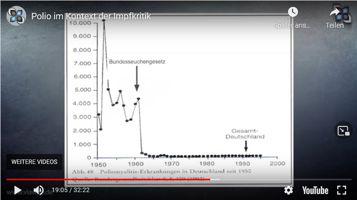 Der steile Abfall der "Poliokurve", der uns seit Jahrzehnten als Erfolg der Polio-Impfung verkauft wird, ist nicht nur wegen der geänderten Zählweise der Poliofälle nach Einführung des Bundeseuchengesetzes unglaubwürdig, sondern auch aus logischen Gesichtspunkten: Selbst wenn die Impfung erfolgreich gewesen wäre, ist ein solch dramatischer Abfall der Poliofälle nicht möglich, man hätte niemals sämtliche Populationen der Bevölkerung in solch kurzer Zeit gleichzeitig durchimpfen können. Auch wären diese fast schlagartig auftretenden, positiven Resultate in so kurzer Zeit schon aus medizinischer Sicht nicht möglich gewesen. Wie das mit der kompletten Durchimpfung einer Bevölkerung innerhalb kürzester Zeit funktioniert sehen wir ja gerade. Und zwar weltweit.