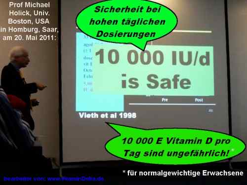 Generell läßt sich sagen, dass es mit dauerhaften Dosierungen bis 10.000 Einheiten Vitamin D täglich noch nie zu einer Vitamin D-Vergiftung gekommen ist. Daher ist die Botschaft dieses Powerpoint-Bildes von Prof Michael Holick auch: "10 000 i.U. is safe" oder "10.000 i. E. ist sicher". Der Grund für diese Sicherheit liegt darin, dass Vitamin D eine unwirksame Vorstufe ist. Erst duch eine streng überwachte Regulierung in der Biochemie unseres Körpers wird das aktive Vitamin D-Hormon daraus hergestellt.