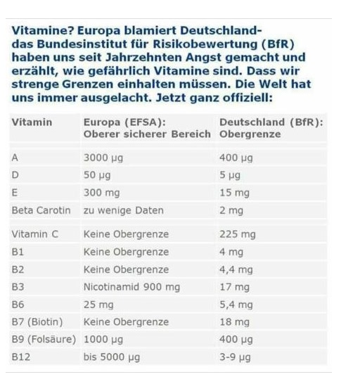 Kleines PS: Zur Vorgeugung und Gesundherhaltung nehmen ja viele Nahrungsergängzungen, vor denen die Mainstreammedien ja unentwegt warnen, dass sie überdosiert wären (im vergleich zu den Richtlinien in Dtl). Das sieht die EU aber offesichtlich ganz anders, denn dort sind viel höhere Werte als unbedenklich aufgeführt (siehe Dateianhang).