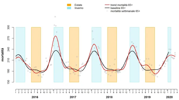 • In Italien lag die nationale Gesamtmortalität der Altersgruppe 65+ bis zum 7. März noch tiefer als in den Vorjahrenˍ; dies insb. wegen des milden Winters (siehe rote Kurve in der Grafik).
