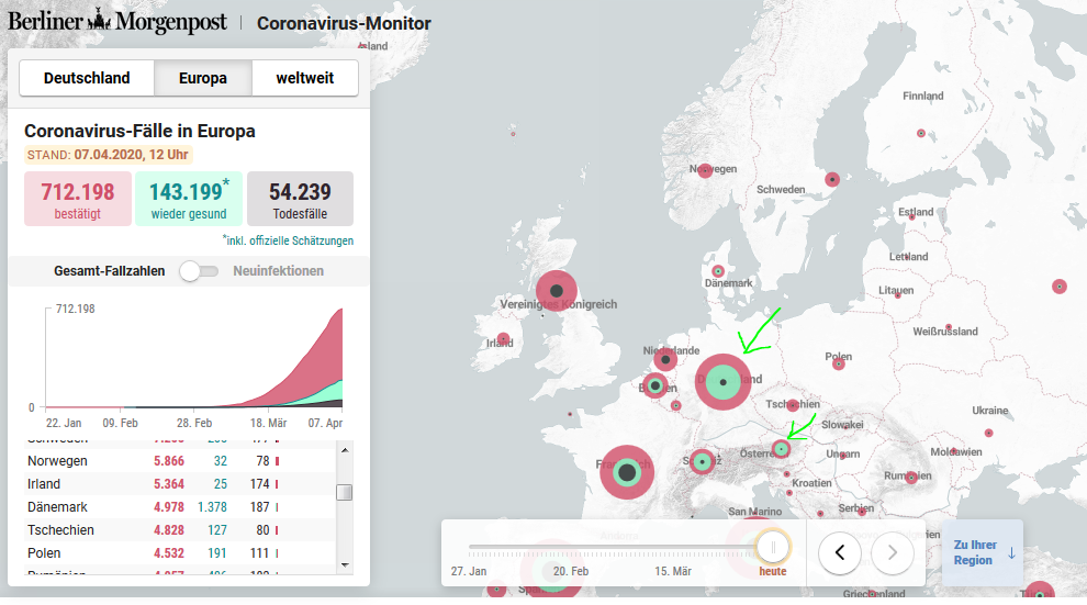 da kann man auswählen Deutschland, Europa, Weltweit und mit verschiebbarer Zeitachse