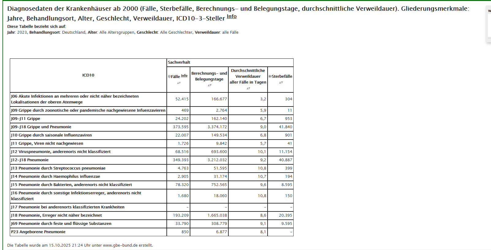 Ach doch, Manfred. Das wissen wir doch zumindest ungefähr. Bei Atemwegsbedingten Erkältungskrankheiten und Pneumonien ( Denn es war immer klar, dass eine schwere Erkältung bei älteren Menschen leicht auf die Lungen übergreifen kann und es dann zur Pneumonie kommen kann.) nach GBE um die 400.000 Krankenhausaufenthalte im Jahr, wie ich letzten aus dem DGE ermittelt und gepostet hatte und man könnte sicher auch nachschauen, wie viele Todesfälle. Natürlich weiß man auch wie viele Millionen Krankmeldungen es deshalb im Jahr gegeben hat, so dass die Krankenkassen, wenn sie denn wollten, eine genaue Angabe machen könnten. Könnte aber sein, dass das DGE das auch erfasst. Denn die erfassen glaube auch die Ausfalltage von Arbeitnehmern in Bezug auf eine Erkrankung.Da kommen natürlich noch die Millionen Rentner und Kinder dazu, die wegen einer banalen Erkältung keinen Arzt besuchen.