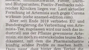 "Unbestritten wirkt also Artemisia-Tee in ausreichender Konzentration gegen Plasmodien; aber über das Ausmaß der Wirksamkeit und die Resistenzgefahr gehen die Meinungen dann weit auseinander. Auffällig ist, dass für westliche Forscher das Thema ein No-go ist; Forschung findet nur vereinzelt statt. Big Pharma ist ohnehin nicht interessiert."