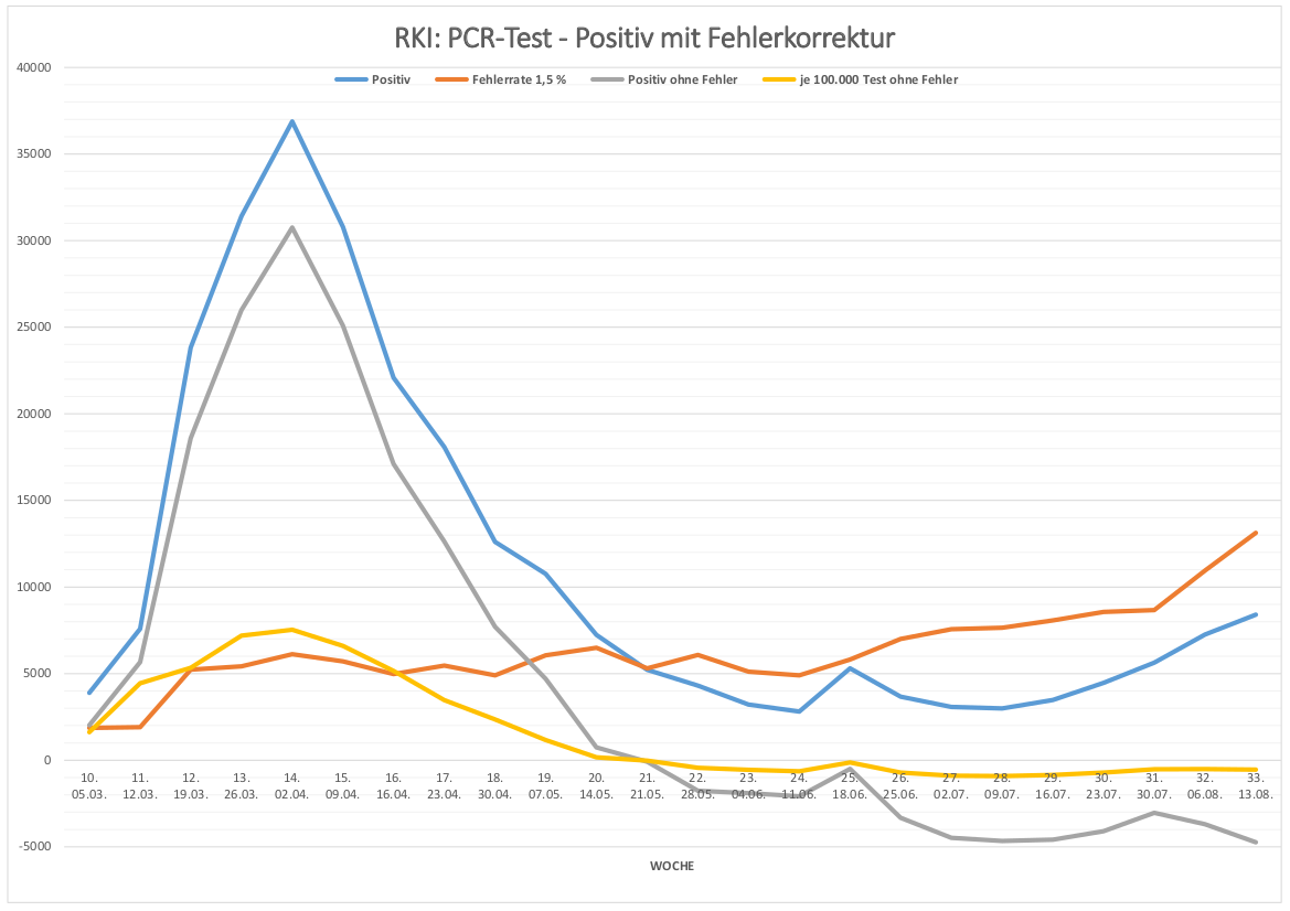 Ich habe gerade einmal die aktuellen Zahlen vom RKI und StBA gezogen. Dabei habe ich die RKI-Zahlen von der Fehlerquote (1,5 % lt. Pharmazeutischer Zeitung) bereinigt. Die Grafik belegt eindeutig, dass es seit der 21. Woche (Ende Mai) keine "Pandemie" mehr gibt. Die bereinigten "Positiven" sind negativ!!!