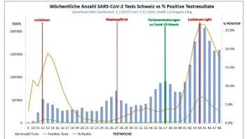 • Dazu passt ganz gut folgende Grafik aus der Schweiz - vor jeder Verschärfung der Maßnahmen wurde mehr getestet: