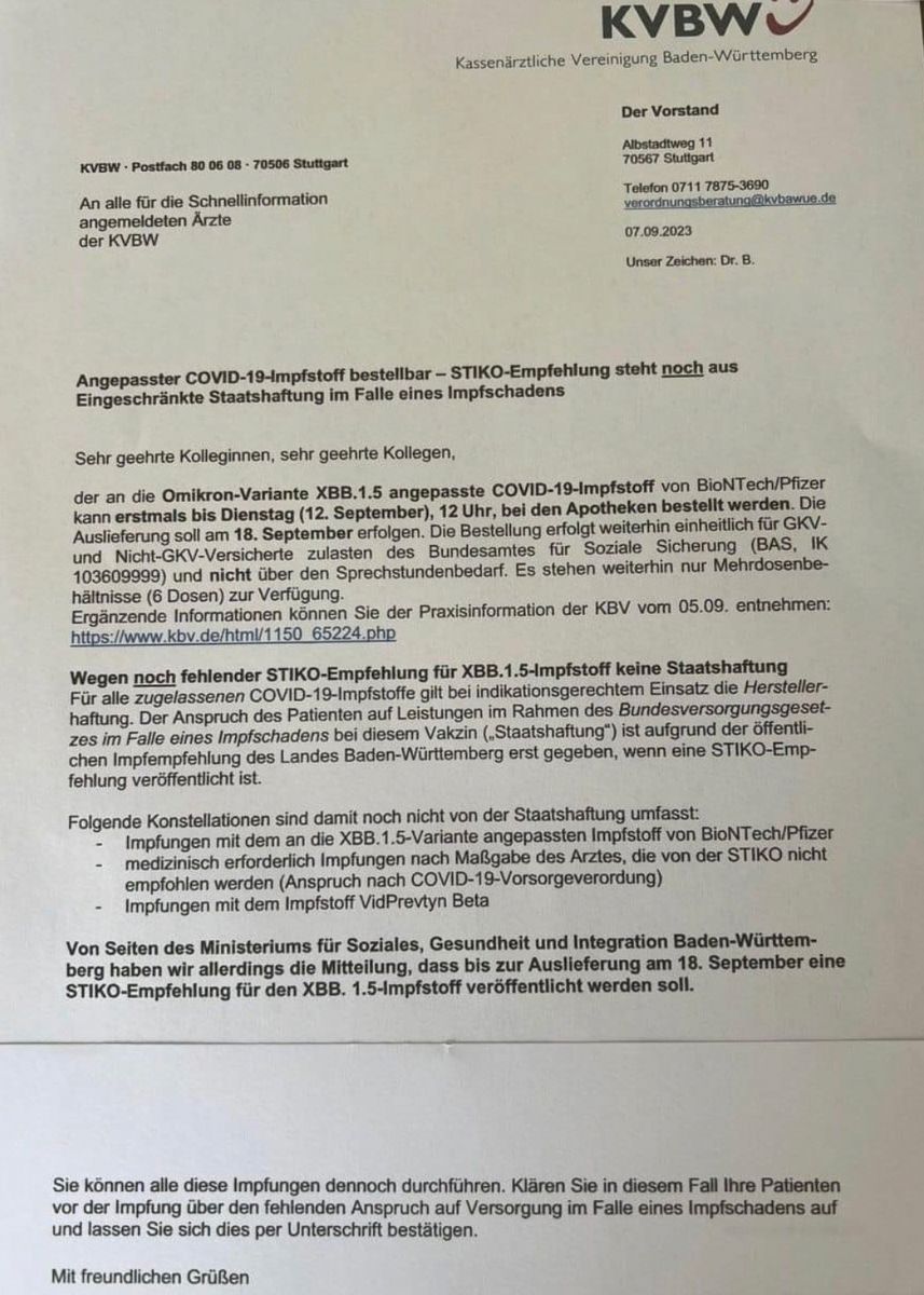 • Die ärztliche Kassenvereinigung von BW bereitet die Ärzte auf Haftungsgefahren zur Covid-Impfung vor! (letzter Satz) :D