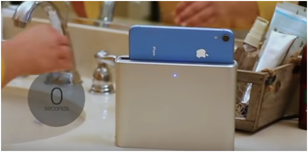 In diesem kleinen Kasten kann man sein Smartphone desinfizieren. Es senkt sich automatisch ab und kommt nach 30 Sekunden frisch desinfiziert wieder heraus. Das Gute dabei - es funktioniert nicht nur mit Apple-Geräten :D