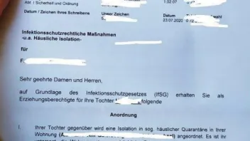 Die Anordnung datiert, wie gesagt, auf den 23. Juli 2020. Personenrelevante Informationen sind im Text unkenntlich gemacht worden. Wir erfahren von der ersten Seite, dass es um eine Tochter geht, die sich unverzüglich in häusliche Quarantäne zu begeben hat.
