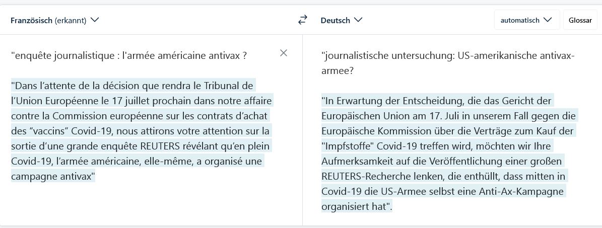 "Dans l’attente de la décision que rendra le Tribunal de l’Union Européenne le 17 juillet prochain dans notre affaire contre la Commission européenne sur les contrats d’achat des “vaccins” Covid-19, nous attirons votre attention sur la sortie d’une grande enquête REUTERS révélant qu’en plein Covid-19, l’armée américaine, elle-même, a organisé une campagne antivax"