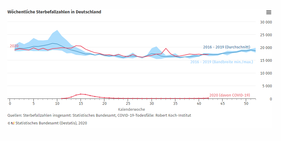 Der rote Zacken in der Mitte der Grafik ist NICHT Corona geschuldet, sondern der Hitze im August in der KW 33 - das war ungefähr Mitte August. Alleine in dieser Woche der Hitze sind 3.288 Menschen MEHR verstorben als im Durchschnitt der Vorjahre. Aber interessiert das jemanden? Nein. Wird da etwas unternommen, wie zum Beispiel Klimaanlagen in Pflegeheimen eingebaut? Natürlich nicht. Ist ja auch kein Virus, "nur" Hitze.