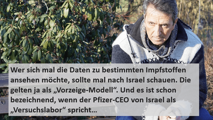„Falls Israelis sich wundern sollten, dass ihre Regierung sie wie Labortiere behandelt, falls sie sich wundern, warum Reisefreiheit, soziale Kontakte oder sogar der Broterwerb sich verflüchtigt haben, dann ist es der CEO von Pfizer, Albert Bourla, der gestern eine aufrichtige Antwort auf diese Fragen abgegeben hatte“.