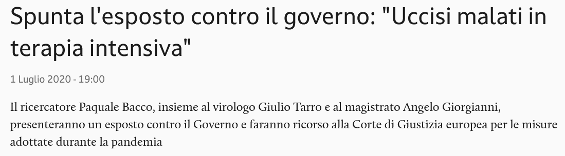 Nun wird Giorgianni zusammen mit dem italienischen Virologen Giulio Tarro bei der Staatsanwaltschaft in Rom eine Klage und auch eine Beschwerde beim Europäischen Gerichtshof gegen die Maßnahmen der Regierung von Giuseppe Conte während des Höhepunkts der Pandemie in Italien einreichen. Initiiert wurde dies allerdings vom Arzt, Gerichtsmediziner und Forscher Pasquale Mario Bacco. Bacco ist Mitglied der OMV und Autor des Buchs "State Massacre - The hidden truths of Covid 19" (Staatsmassaker - Die verborgenen Wahrheiten hinter Covid 19). Bacco hat in den italienischen Medien den Spitznamen "doctor no vax".