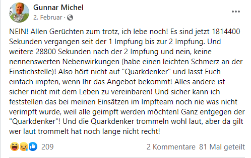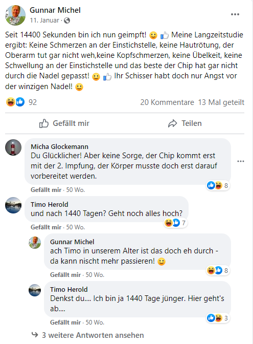 Der facebook Nutzer Gunnar Michel hatte sich mit Witzen zur Covid Impfung besonders hervorgetan: