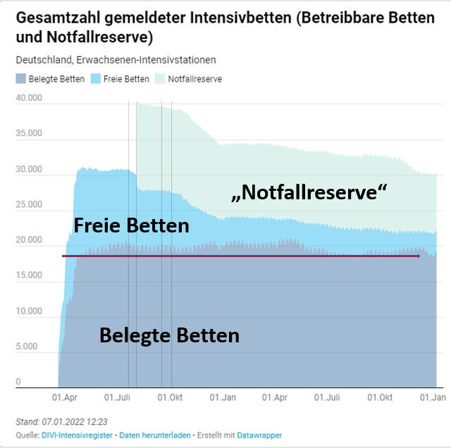 Das sieht man alleine schon an den Intensivbetten. Als das Register im April 2020 begann konnte man noch über 30.000 betreibare Intensivbetten ausweisen. Jetzt 2022 hatten wir kurz die 22.000 unterschritten: