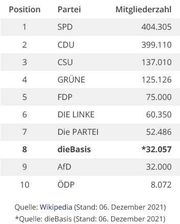 Gleichzeitig hat die Partei mit Datum vom 06. Dezember 2021 über 32.000 registrierte Mitglieder und damit etwas mehr als die AfD:
